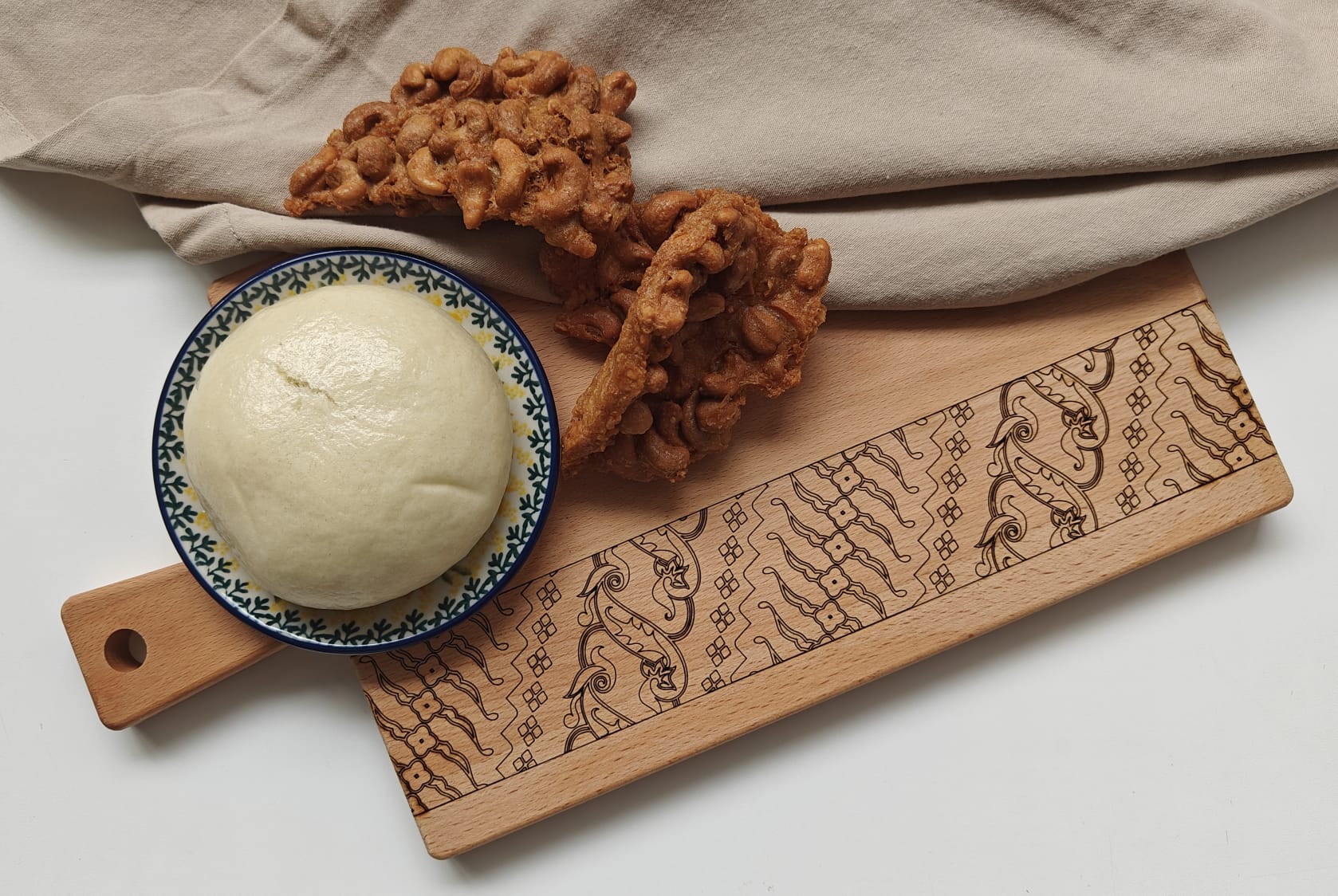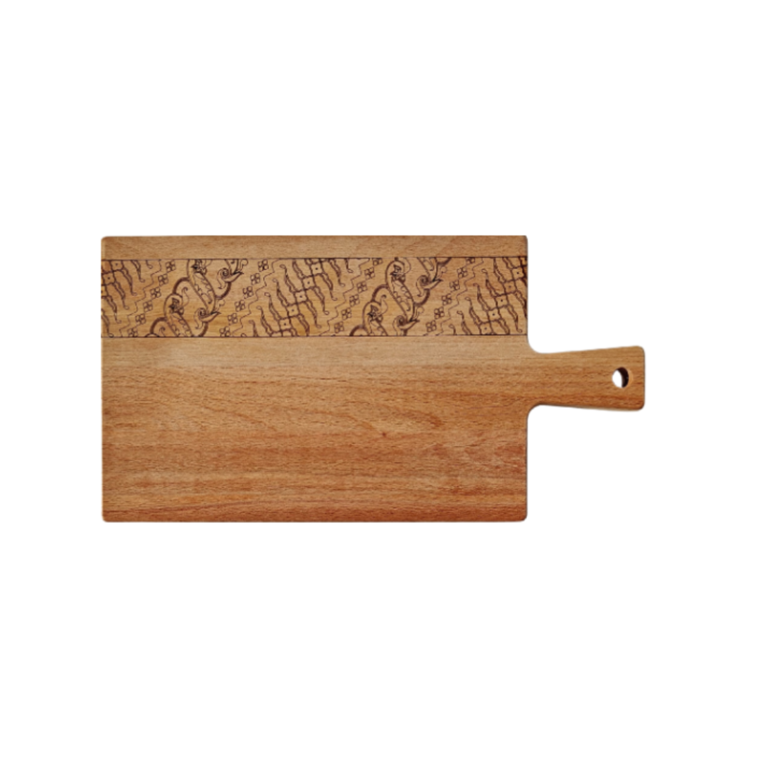 In de borrelplank is een mooie gravering gemaakt van details van de batik parang print. Op deze manier heb je een unieke manier van serveren van al jouw heerlijke hapjes.