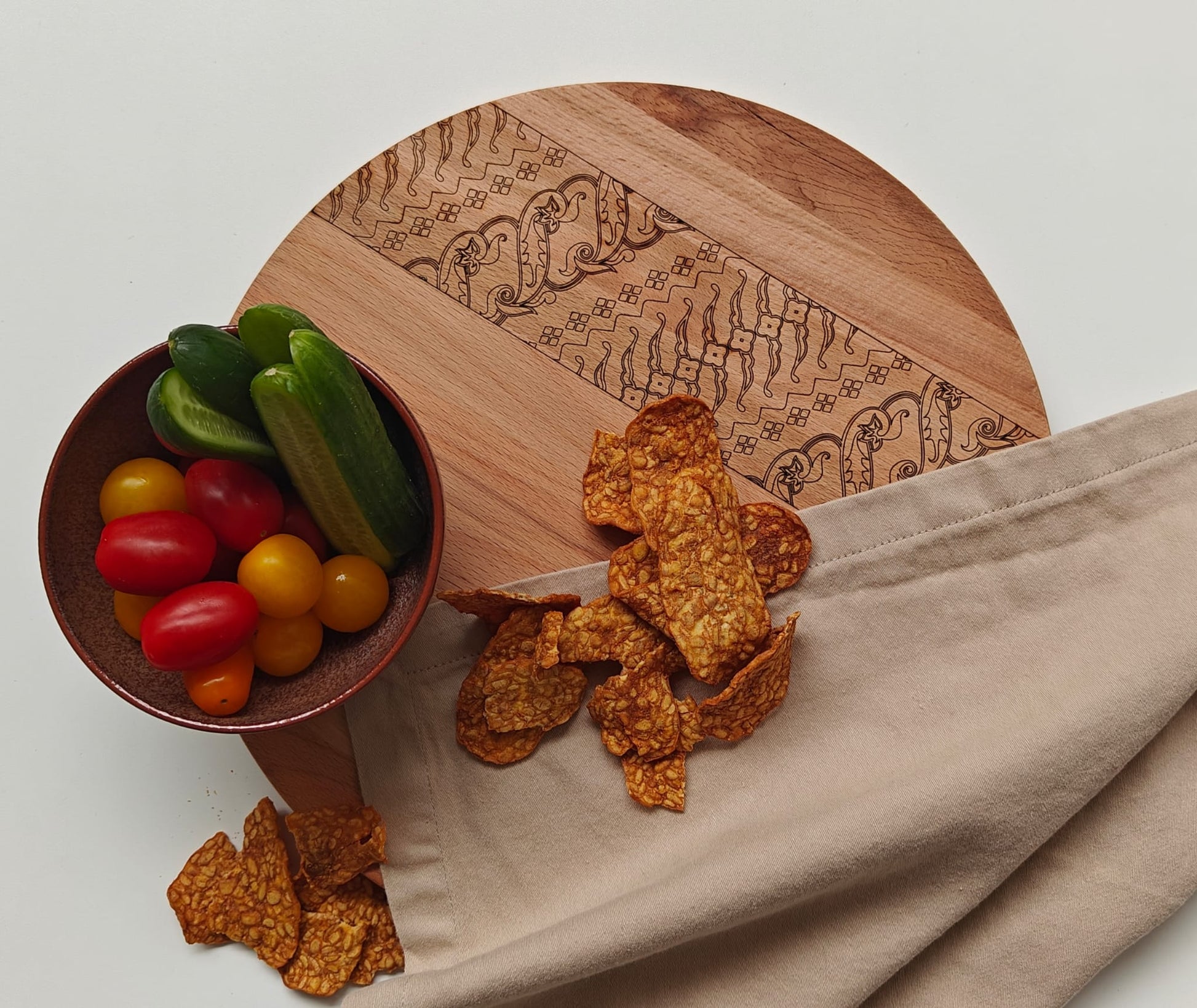 In de borrelplank is een mooie gravering gemaakt van details van de batik parang print. Op deze manier heb je een unieke manier van serveren van al jouw heerlijke hapjes.