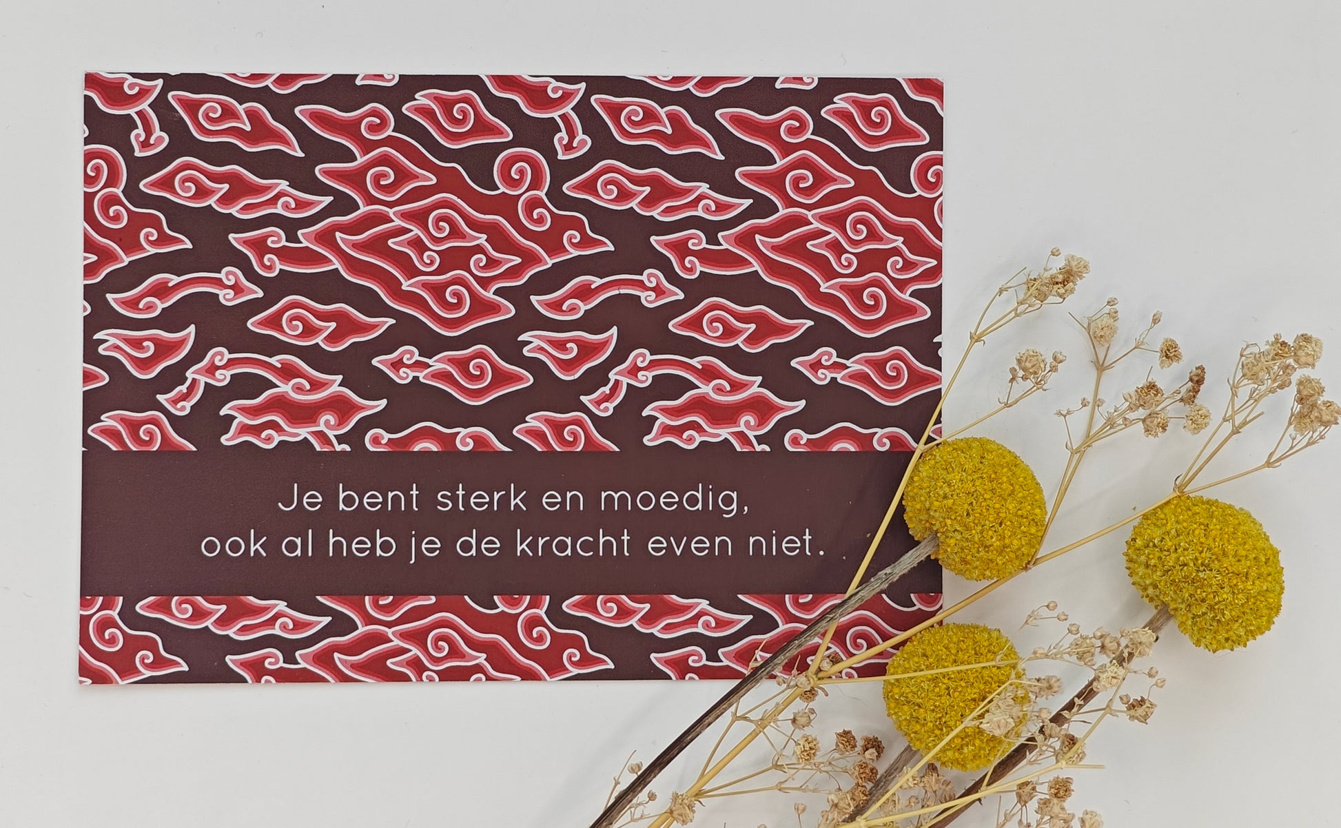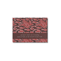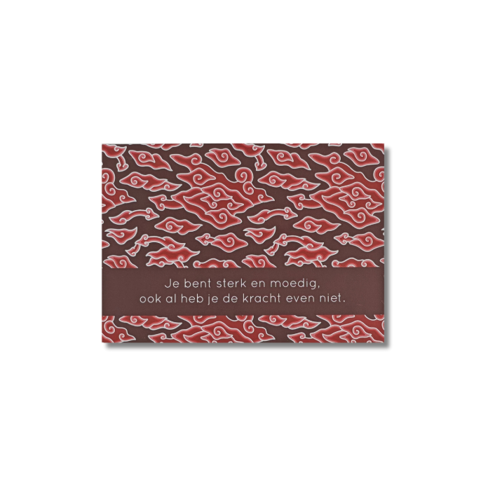 Het patroon Mega Mendung in een mooie warme kleur. Het patroon symboliseert de wolken. Het verhaal achter dit patroon zou zijn, dat men in droge tijden naar de wolken keek en op regen hoopte. Mega Mendung weerspiegelt hiermee wilskracht, geduld en kalmte. Stuur dit kaartje naar iemand die je een hart onder de riem wilt steken.