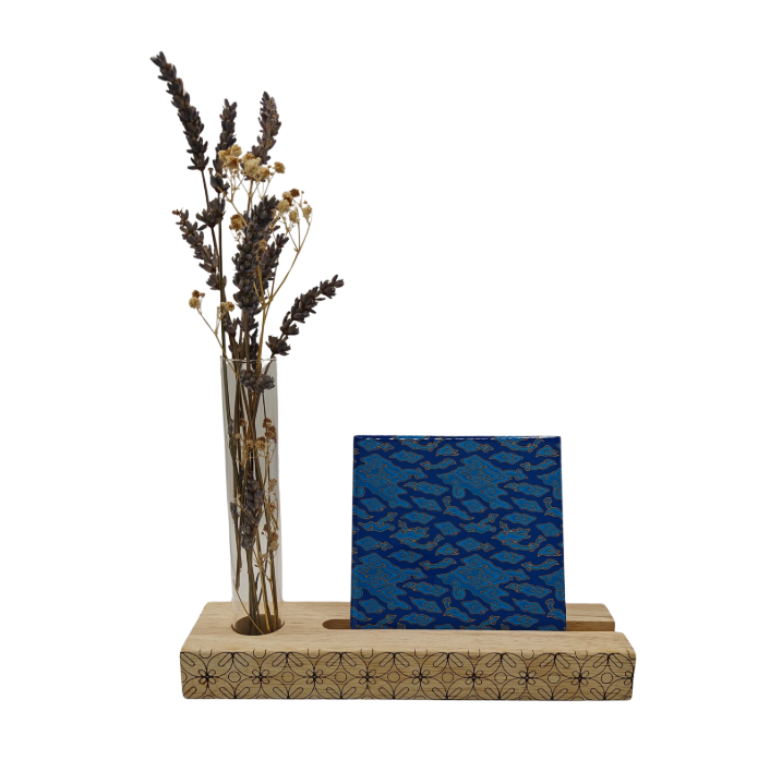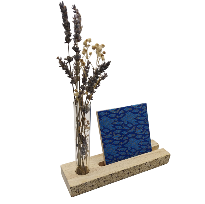 Hoe leuk is deze tegelhouder met ruimte voor een proefbuisje (meegeleverd)! Superleuk met een stekje of jouw favoriete (droog)bloemen erin. Zo staat jouw keramieke tegeltje er heel gezellig bij. Met een gravering van batik aan de voorkant. Een uniek cadeau voor jezelf of voor wie je maar wilt!